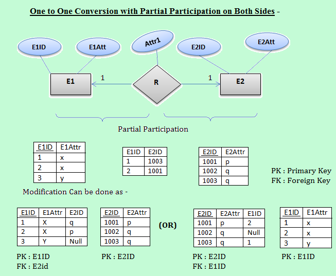 There are two possible approaches on the basis of Participation Constraints –- Partial Participation on Both Sides – For each One to One Cardinality between E1 and E2 with partial participation on both sides, modify either E1 or E2 to include the primary key of other table as a foreign key.