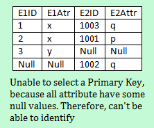 If we try to minimize the above ERD in a single table, i.e. E1RE2, then it contains too many NULL values, and therefore, we are not be able to select a primary key. For example,