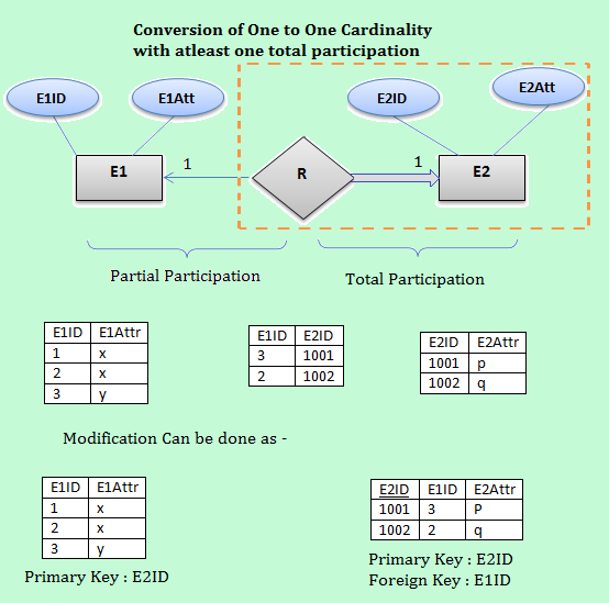 - Cardinality with atleast one Total Participation – For each One to One Cardinality between E1 and E2 with atleast one total participation, modification is done only on total participation side.