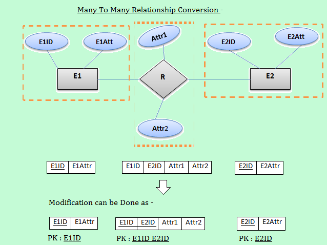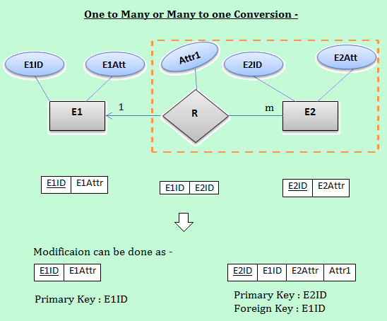 - For each one to many relationship between E1 and E2, modify many side relation to include from one side as a Foreign Key.