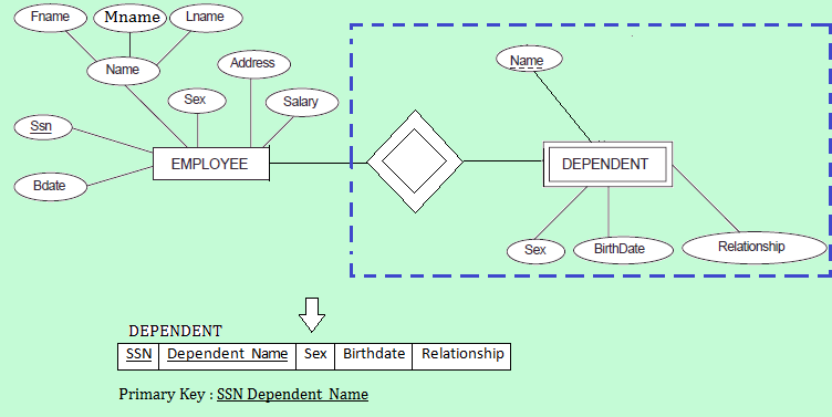 - Select the Primary Key attributes of strong entity and the partial Key attribute of the weak entity, and declare them as primary key