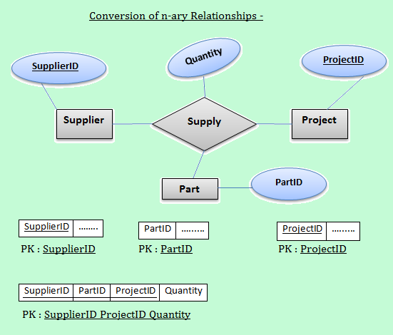 - For each n-ary relationship, Create a separate table and include primary keys of all other entities as a foreign key.