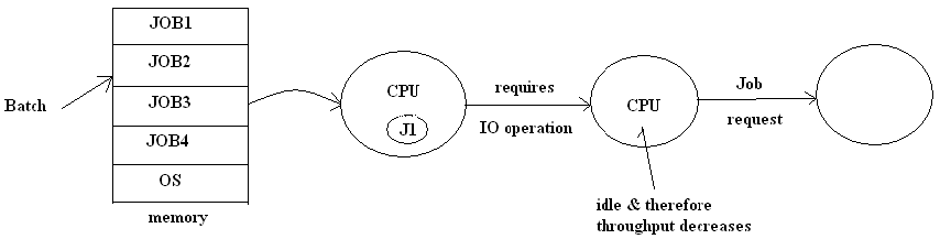 In Batch operating system, FIFO is used i.e only second job will go to execute if first would complete.