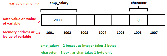 lvalue of emp_salary = 1001 lvalue of character = 1006 rvalue of emp_salary = 20000 rvalue of character = d